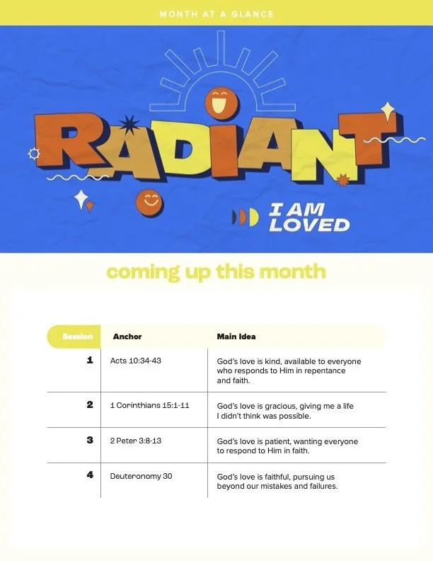 Each month, our kids will be aligned on the same Biblical truth. This is phrased as an "I am _ " statement to anchor identity of who they are because of who God is. These 12 simple, Biblical truths combine to create a 12-month rolling Scope and Sequence. This rolling Scope and Sequence is viewed as circular, rather than a traditional linear approach. Each year, kids will study all 12 Biblical truths with new, fun, and engaging monthly themes, activities, Bible stories, and media.